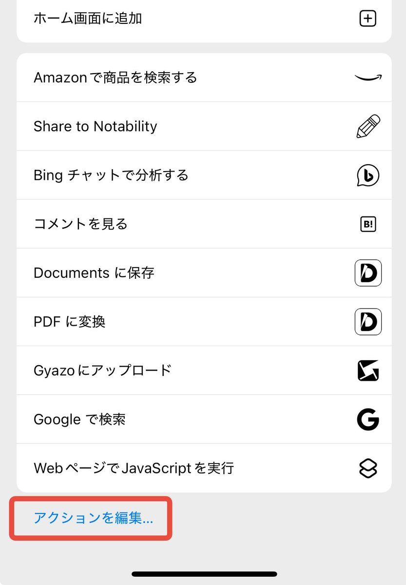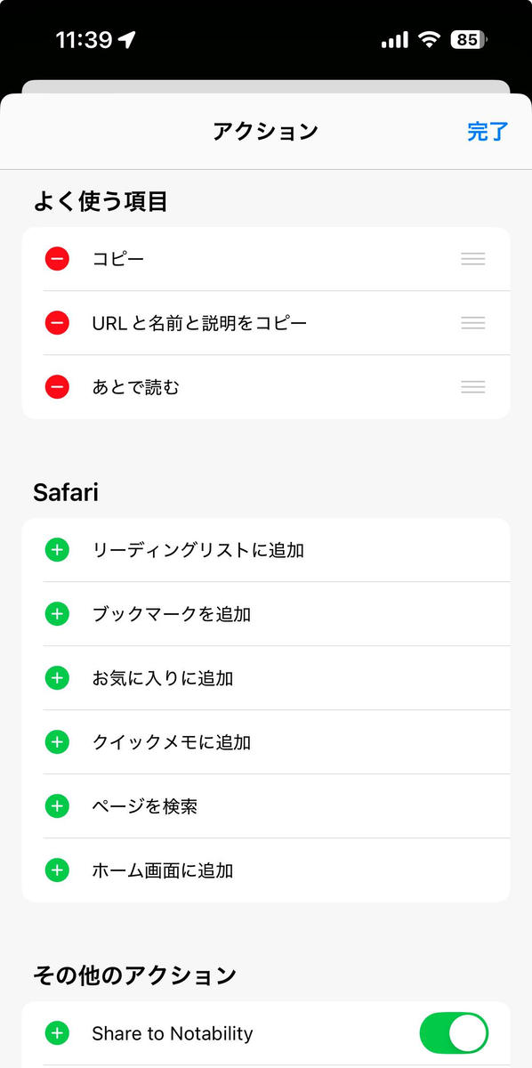 この段階でSafriの共有メニューから利用できるが、めっちゃ下にいて使いづらいので、共有メニューの一番下にある「アクションを編集」で、今回作ったやつを「よく使う項目」にする(左にある緑のプラスボタンをタップ)。